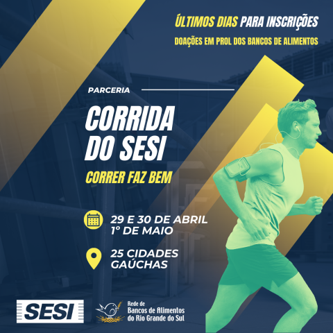 O circuito de corridas solidárias do SESI acontece nos dias 29 e 30 de abril e 1º de maio, em 25 cidades gaúchas. Todas as provas são beneficentes, com a inscrição de 45 reais totalmente revertida para o Banco de Alimentos do Rio Grande do Sul.